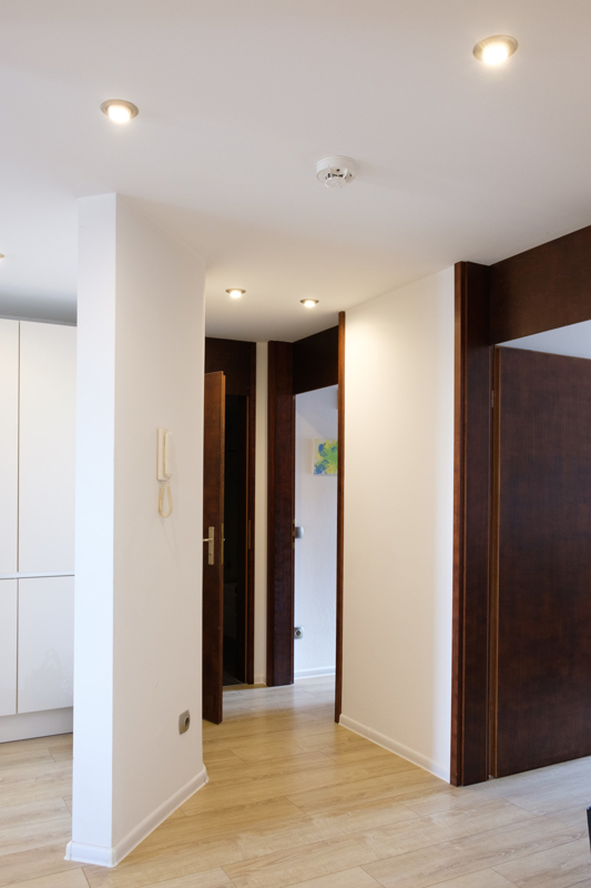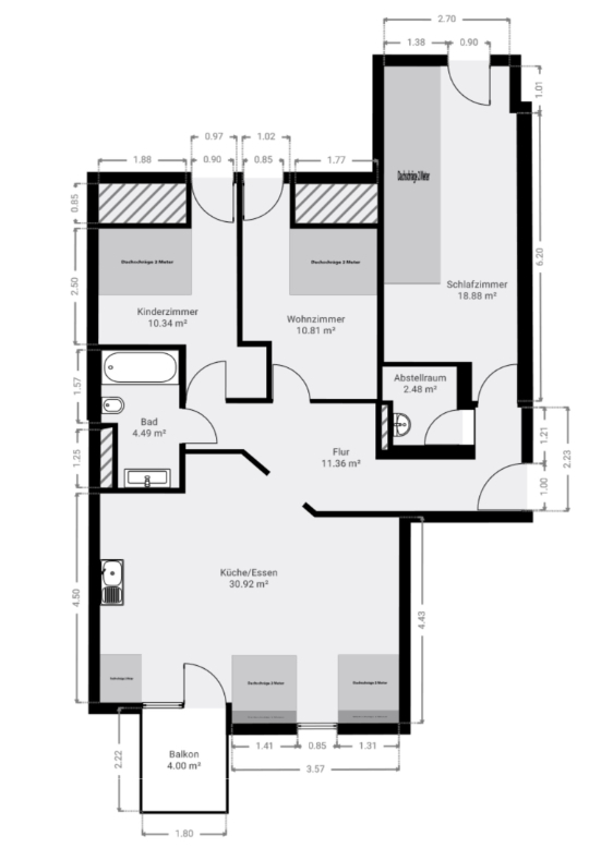 Vom Eingangsbereich gelangt man in den Flur der Wohnung mit direktem Zugang zum Schlafzimmer mit Einbauschrank. Die weiteren Räume, das Wohnzimmer und das zweite Schlafzimmer (Kinderzimmer) sowie der Essbereich mit offener Küche sind ebenfalls direkt vom Flur aus erreichbar. Der nach Westen ausgerichtete Balkon ist direkt vom Essbereich aus zugänglich und lädt zum Verweilen im Freien mit Ausblick ein.